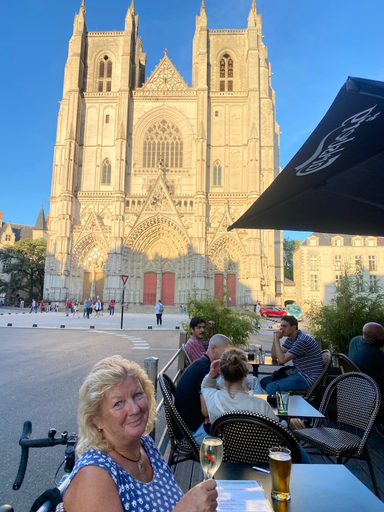 On route to Nantes, after another chaotic boarding. The young vélo controller badly tied our bikes up with 2 others and after a few miles they all came crashing down it the aisle🤬 Sue’s was badly scratched and my mirror popped off.