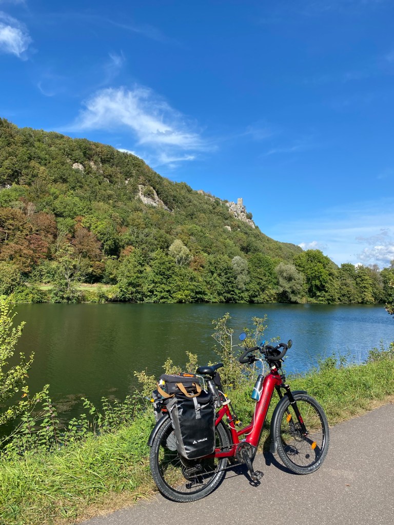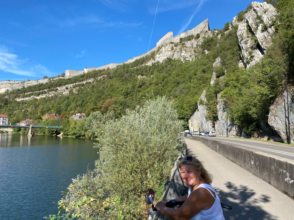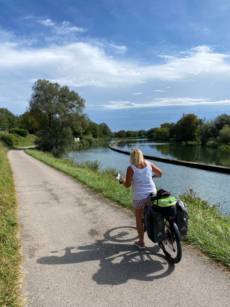 The canal follows the course of the River Doubs and here it is separated by a concrete wall. Every time the river does a meander a channel has been cut with a lock and a weir in the river, to make a shortcut.