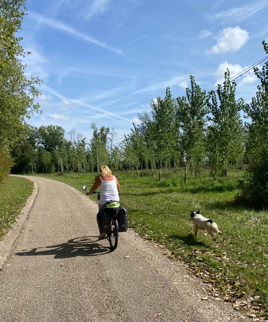 Shortly after lunch we picked up a follower, who decided he needed some exercise. We asked a couple of people if they knew where he was from, to no avail. Fortunately some walkers came by who he then befriended. We had to set off to again to pass the walkers and dog. We needed to pedal as fast as possible for a km to ensure he didn’t follow us! Our track then returned on the opposite side of the canal and we could still see our canine friend with the walkers!!