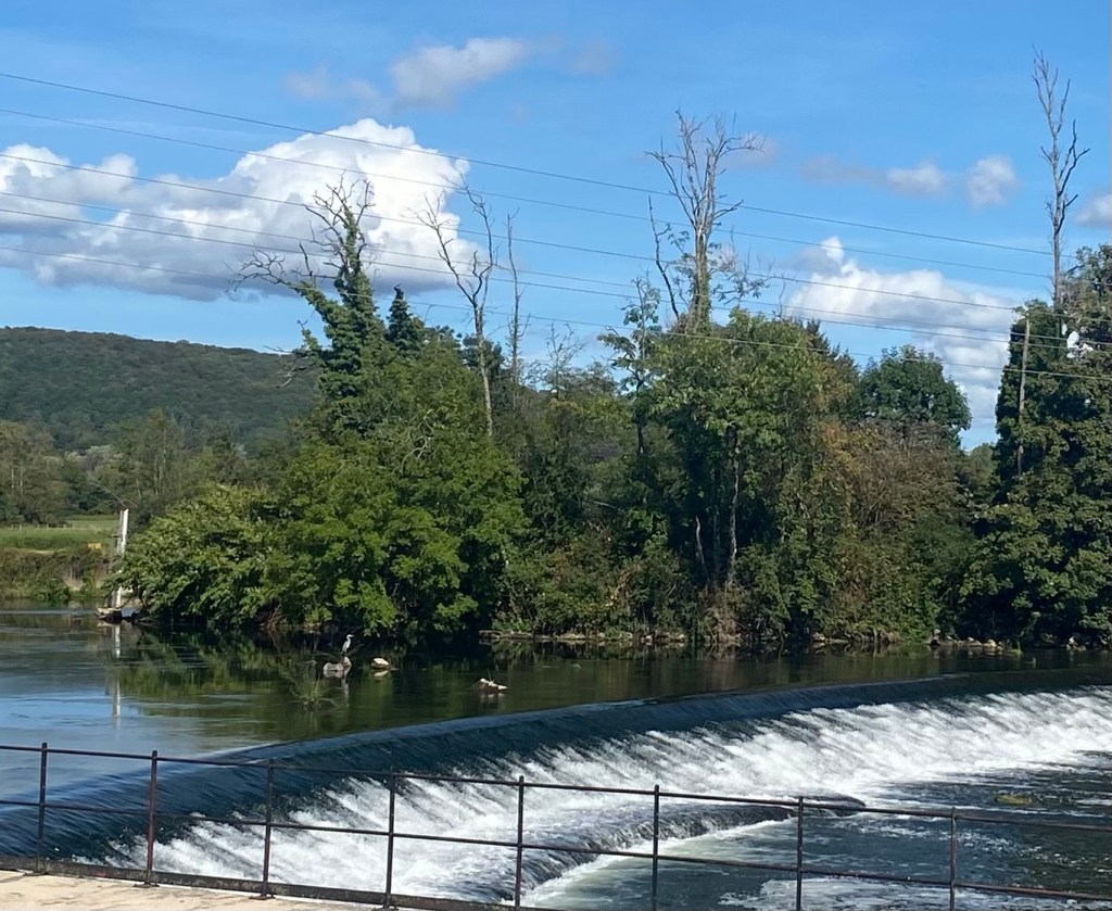 The river is now navigable, so locks and weirs are regular features. Every weir seems to have a heron who’s claimed his fishing rights to it.