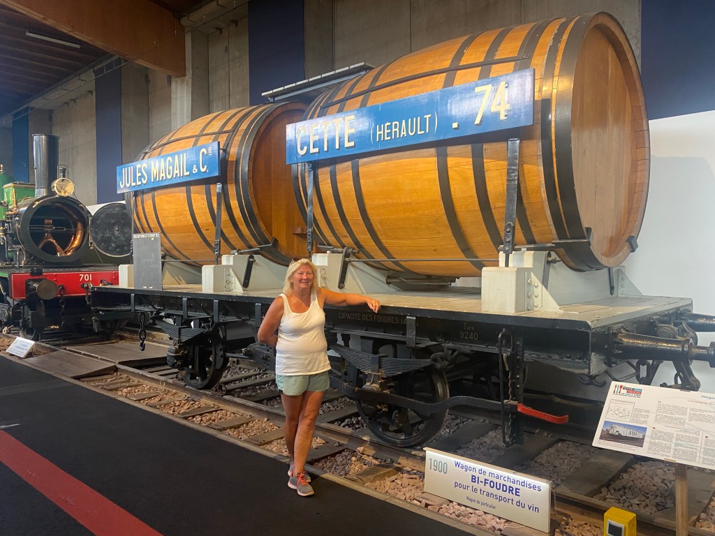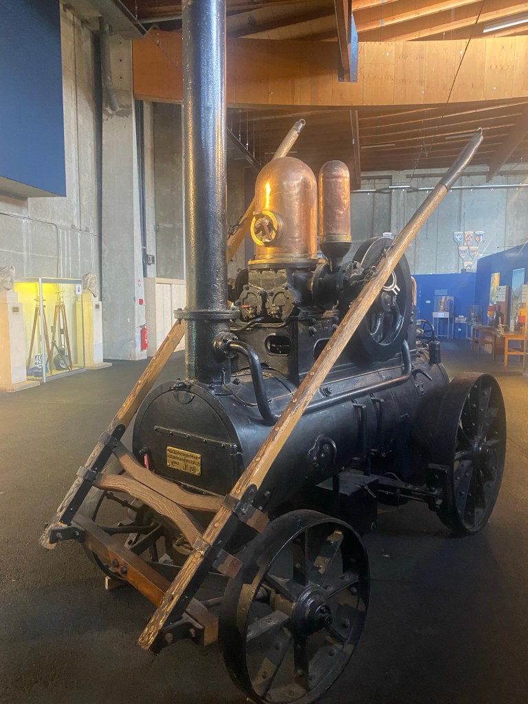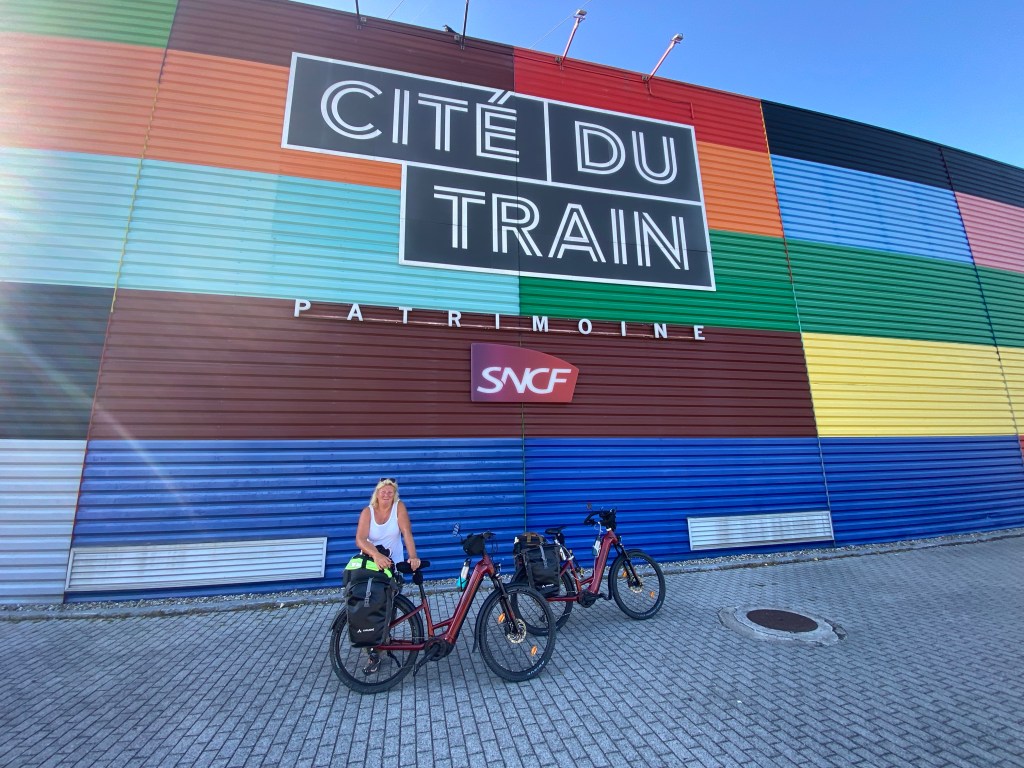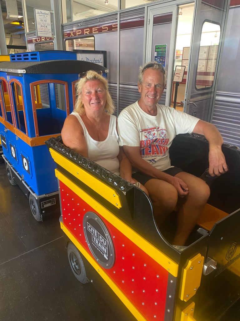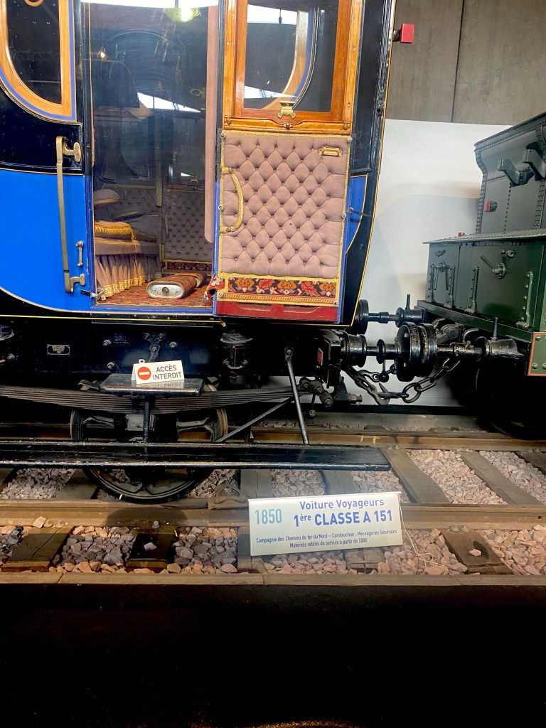 Our bikes were kept secure for us by the friendly staff, whilst we enjoyed the exhibitsI loved this early steam powered vehicle. It needed the connection to a horse; just in case!! Such a huge steam locomotive. The wheels were taller than me. Sue’s favourite railway carriage!It amazed me how plush the first class carriages were, 173 years ago. They even had hot water bottles to put your feet on!!We had to do the Petit Train tour; although comfort is definitely less important nowadays!