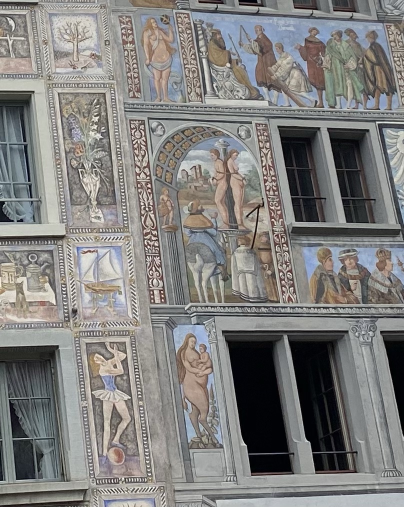 “Very odd nude scenes: a mother with cows feet?!!”: The mother also sports a tail as you may notice. Historically these types of images were used to show the Devil in disguise. Often he was shown with goat feet and a tail. A lot of these wall paintings have religious connotations. The religious history of Switzerland is rather complicated, although perhaps not more so than that of other countries.