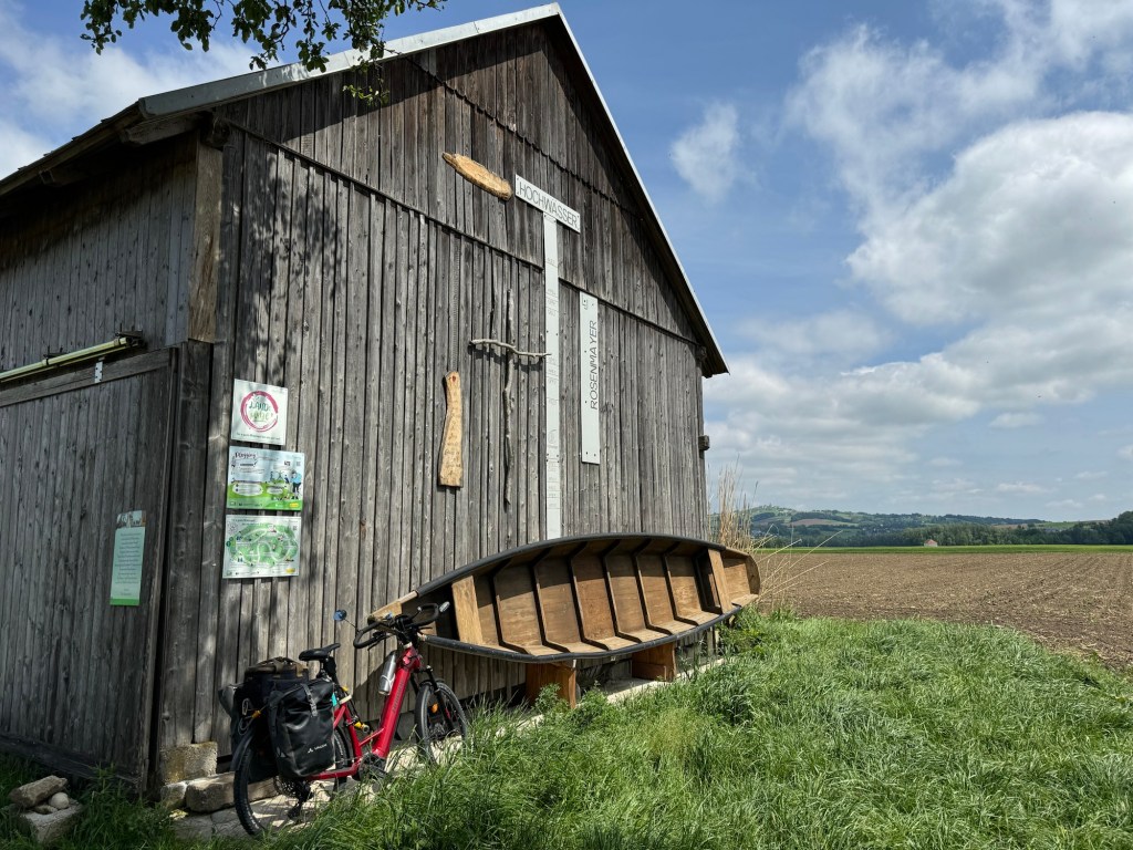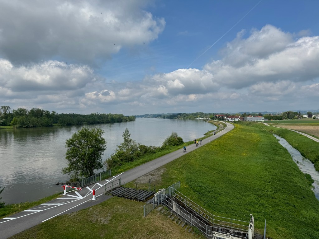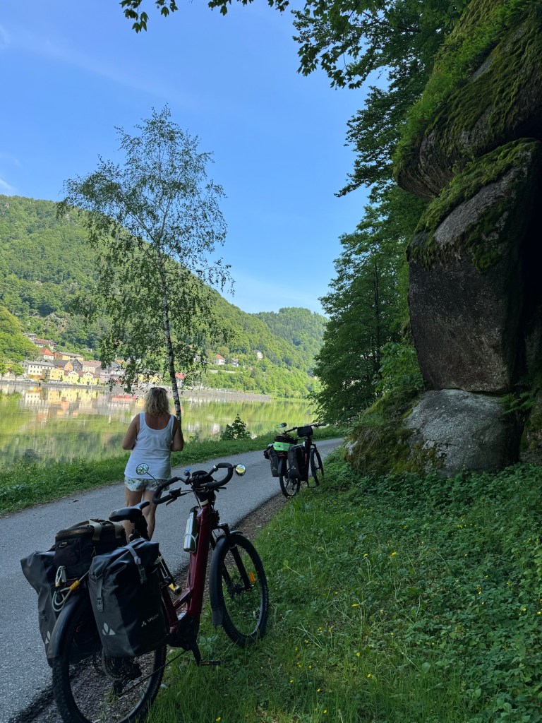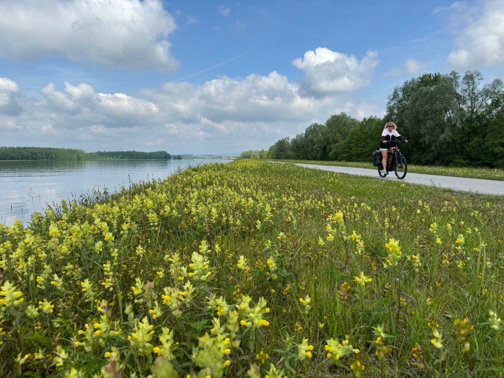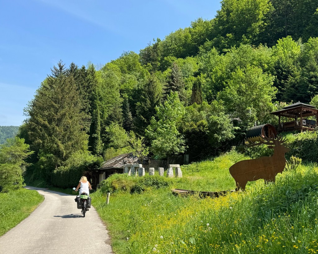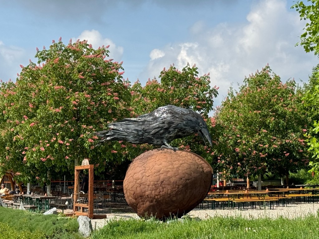 We had a late start, but we cruised along the river path for 20 km feeling good. The path took us past a crow eating an enormous walnut.