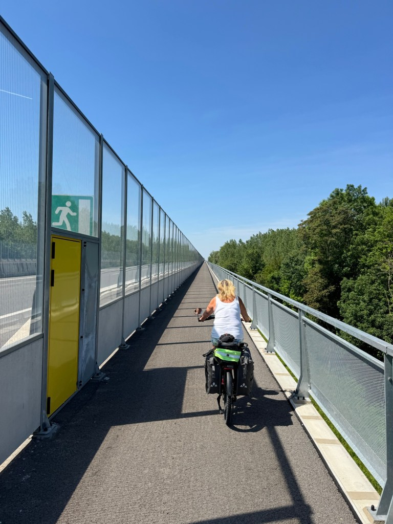 We crossed on a very swish cycle path attached to the side of this bridge. Great views of the wide river