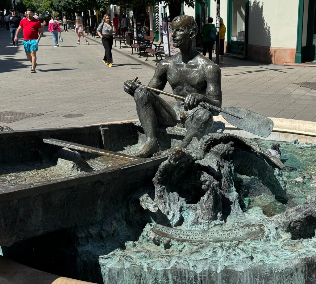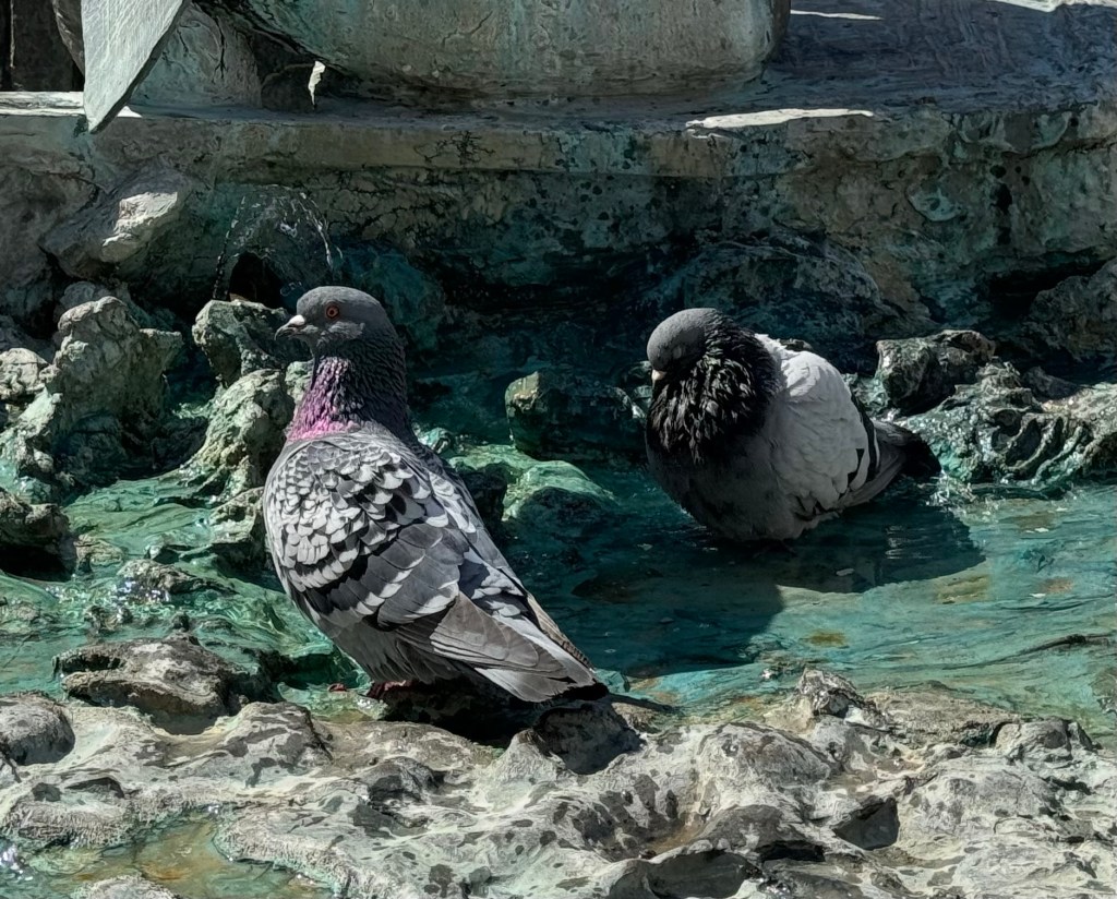 A pair of town pigeons bathing in a town sculpture The pigeons had little attention paid to them, as most people were focused on the man in the canoe with a solid gold dick!The town hall