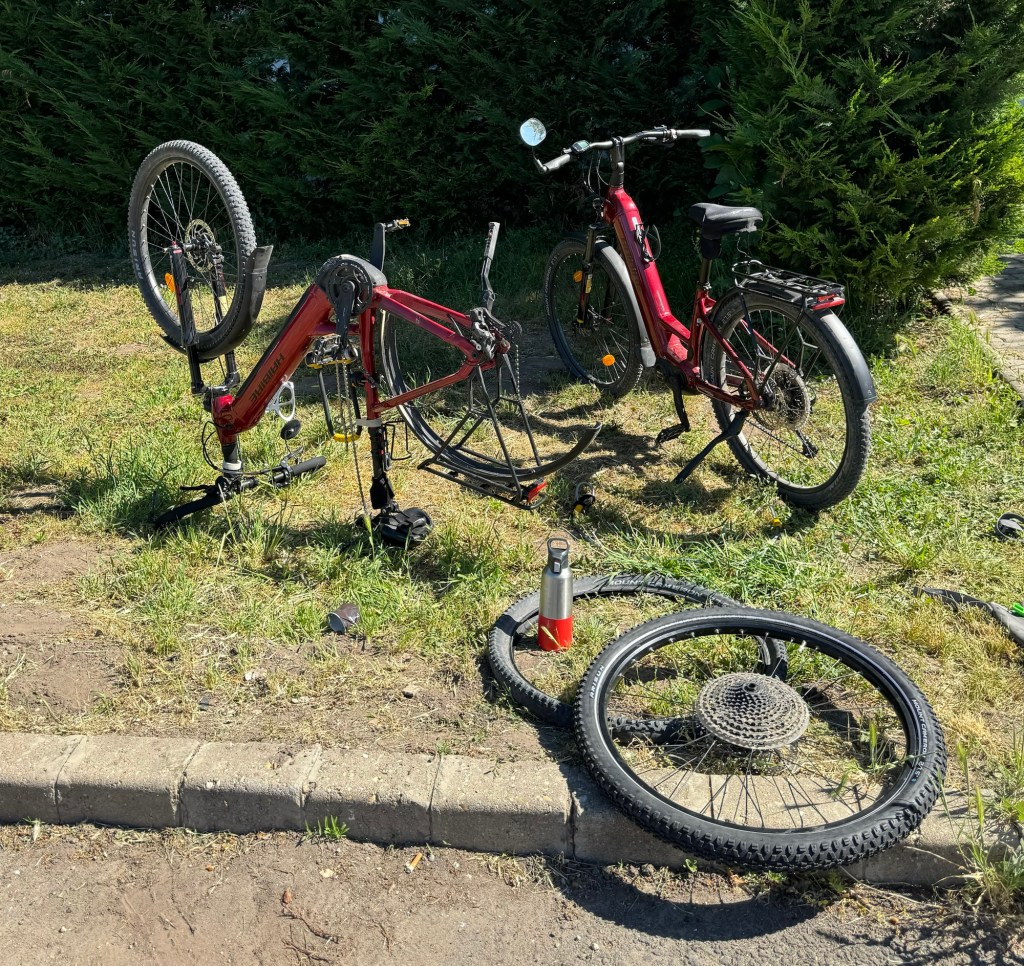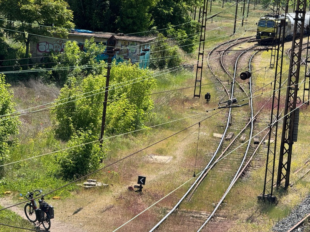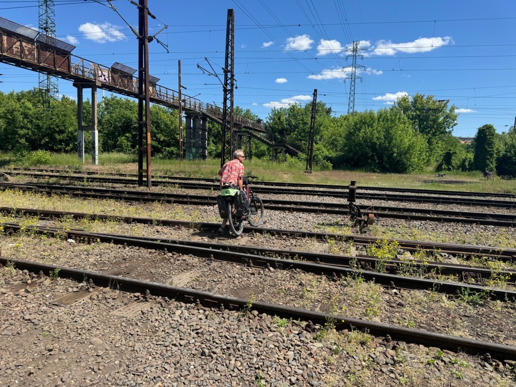 We followed a marked bike route but then came to a multitrack railway with a high bridge gantry over it. There was a small channel to push a bike up, but we’d have had to unload the luggage and carry it over. Otherwise the bikes would have been too heavy to push.