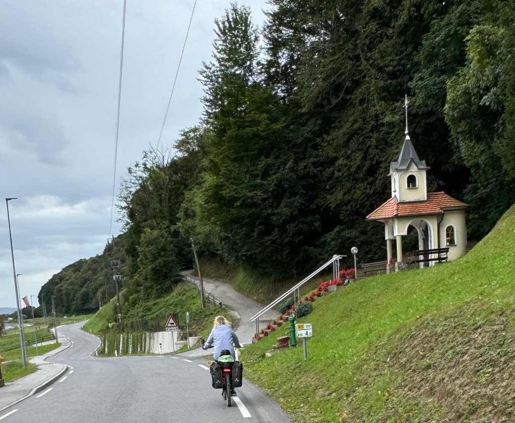The busy road was unpleasant with many trucks. We kept the speed up at 25 km/h and we were soon back on lanes and small roads into increasingly pretty countryside.