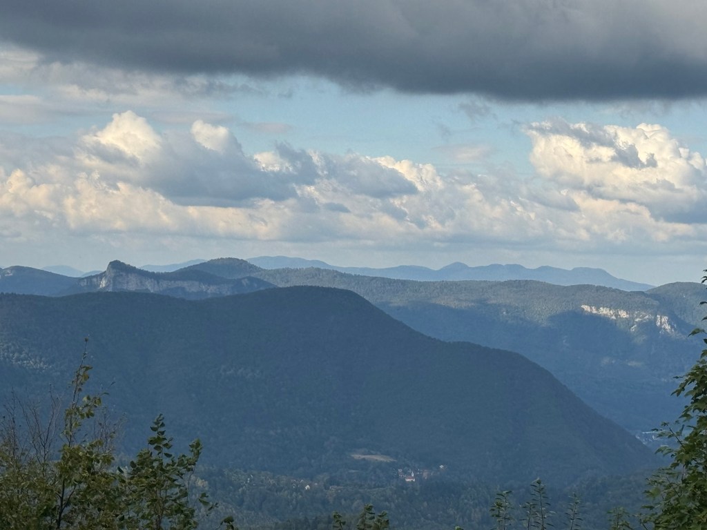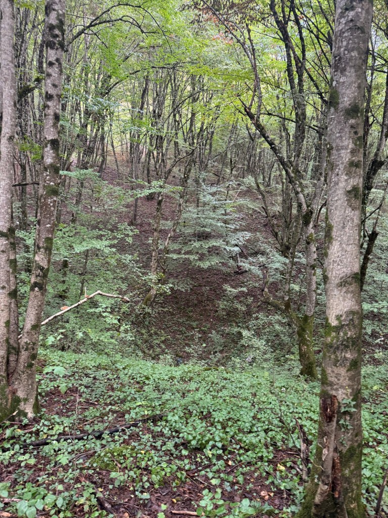 What a great place to cut your winter firewood and store it in the dry!It was starting to get very mountainous. The red line points to a village church we subsequently stopped for lunch.