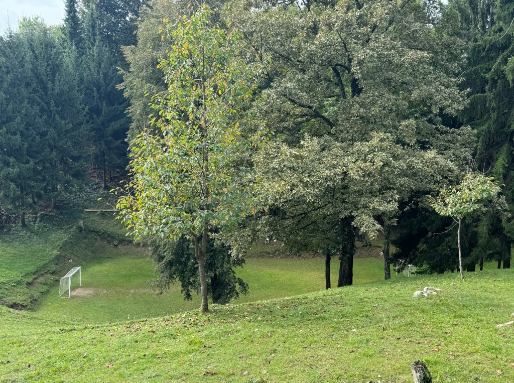 This hole was about 50 ft deep although the photo doesn’t illustrate it too wellAnother sink hole being used as a small football pitch; at least the ball stays confined!