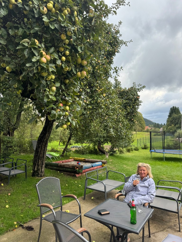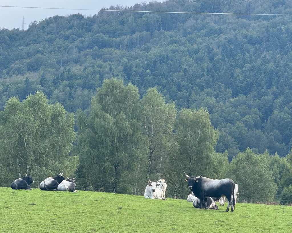Lunch by the pretty, noisy church The church that we’d seen from afar.Even more mountainous still; the batteries were doing us proud but were rapidly tiring, like our legs.We stopped for a drink at 2500ft under a laden apple tree, and managed to charge my battery behind the bar for free👍🏼 (Sue’s still had enough power remaining; not sure why🤔)We decided to try some more small roads and cycled past these unusual cattle.