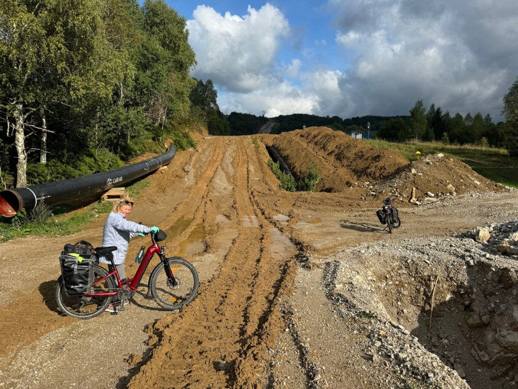 The small road became very “off road” and took us over some muddy pipe laying works.
