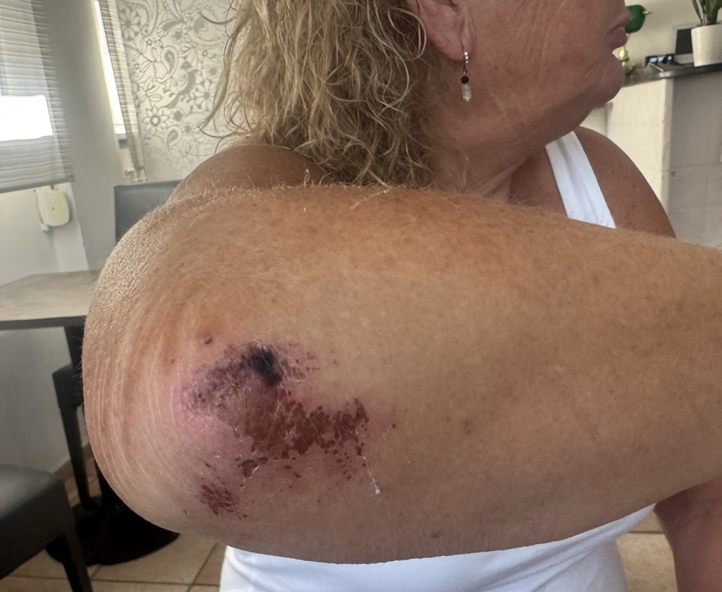 Fortunately nothing more than a grazed elbow and some other minor wounds to her ankle . We were back in our room in no time to patch her up and ensure she didn’t bloody the sheets🤭