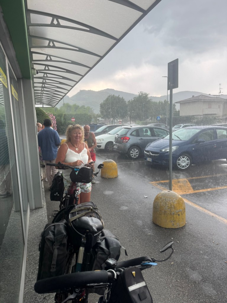 We had only cycled about 12 kms, when we felt spots of rain. I could see we were only a few kms from the next village so we upped the power and only just made it to a Co-op supermarket with a useful outside awning, when the heavens opened.
