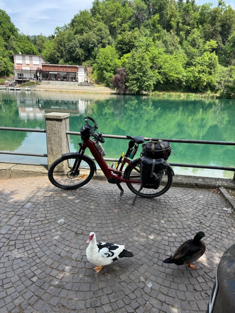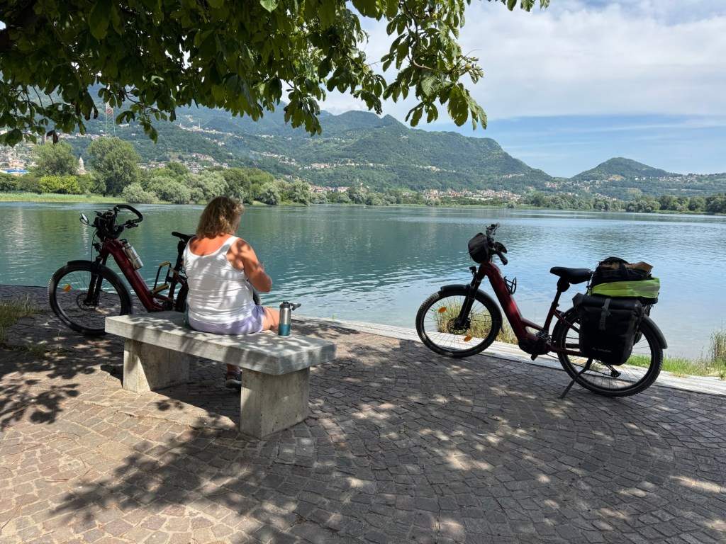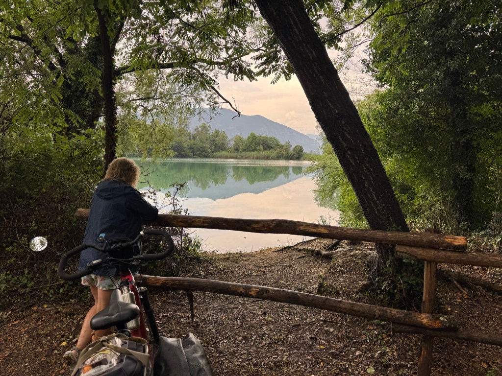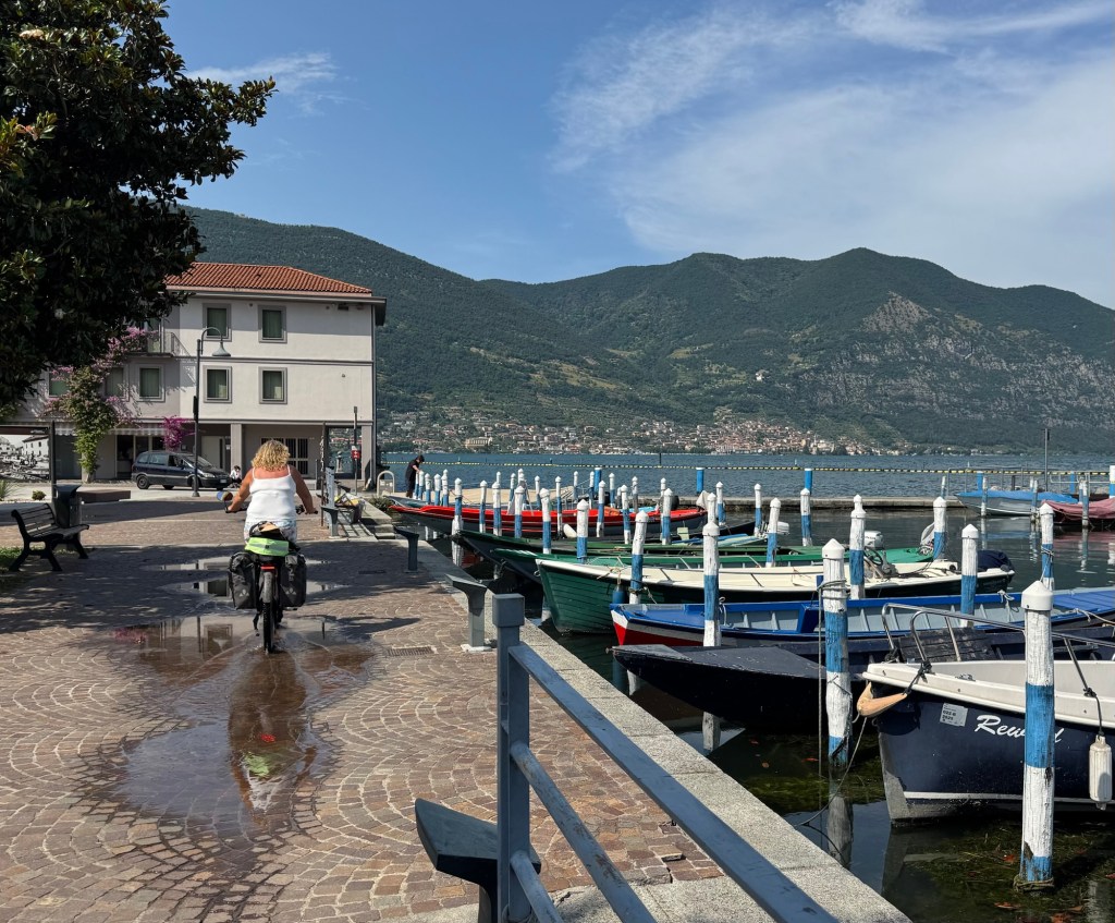 We followed a mapped bike trail to Lake Iseo, only to find that it was now a protected nature area and bikes were banned😡 The person we saw was fisherman who told us there was a guard ahead who would likely fine us if he saw us on bikes. We reluctantly we returned 2 kms and took the busy road route.