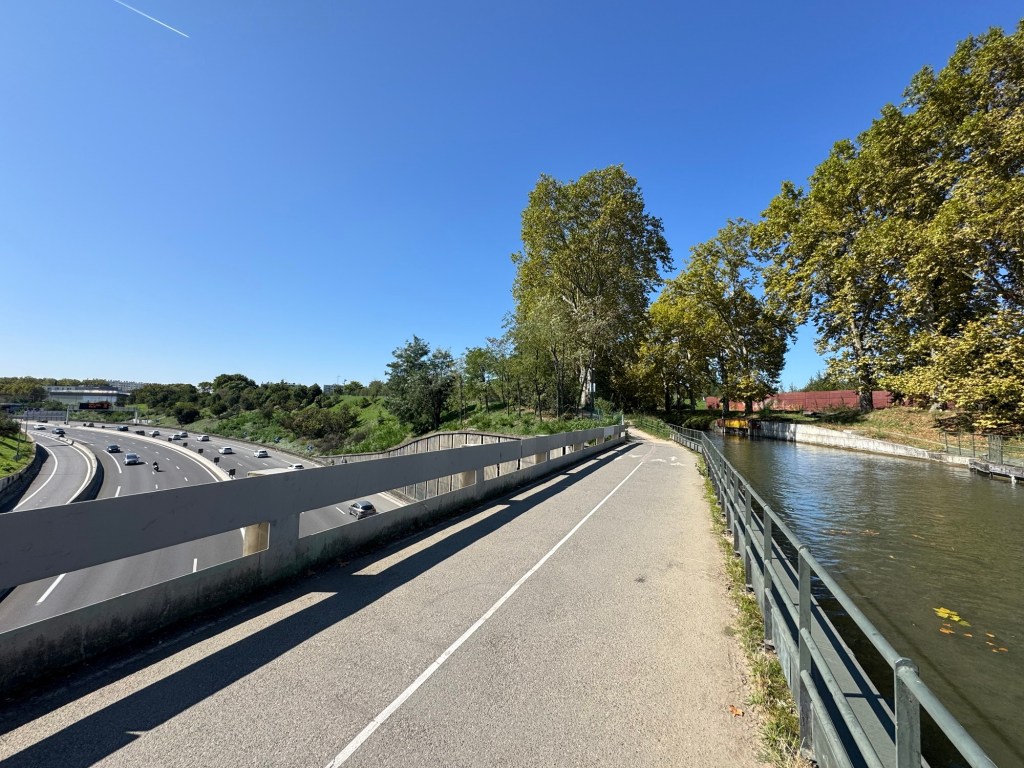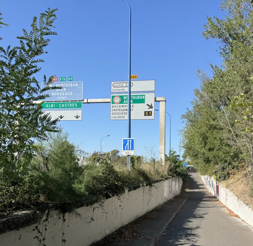 Heading out of the city, with very familiar signs above. Our usual route to our home from Toulouse airport. We never knew before that the cycle route was so close!