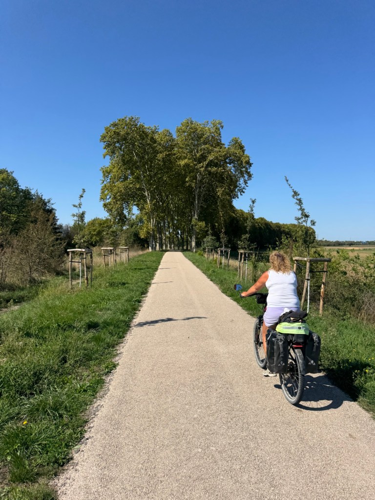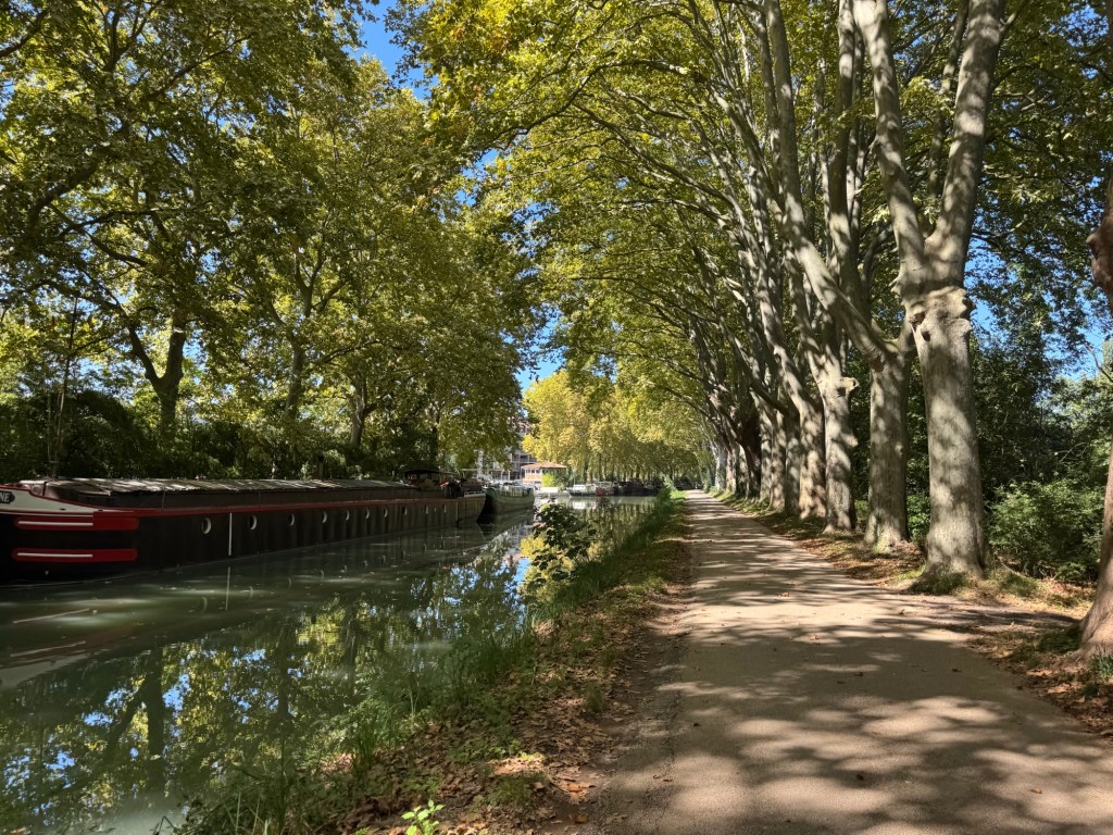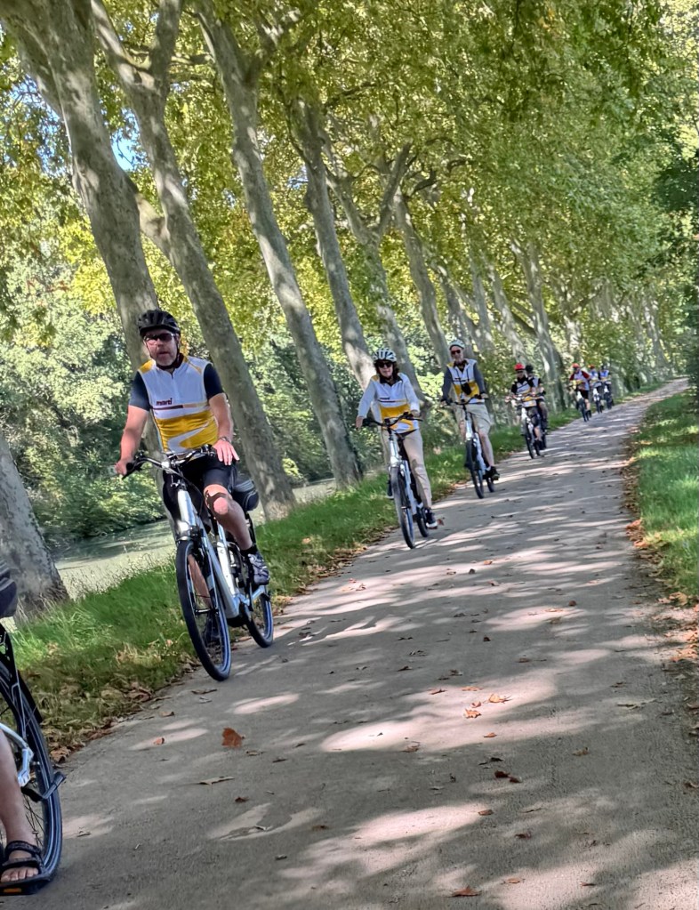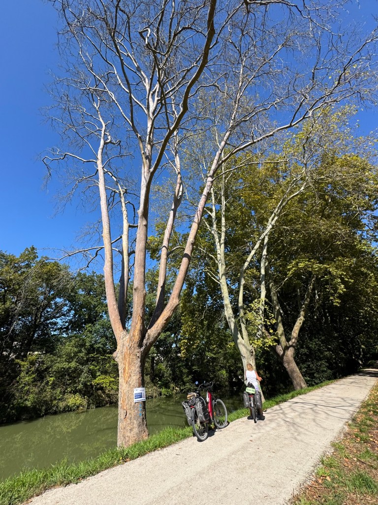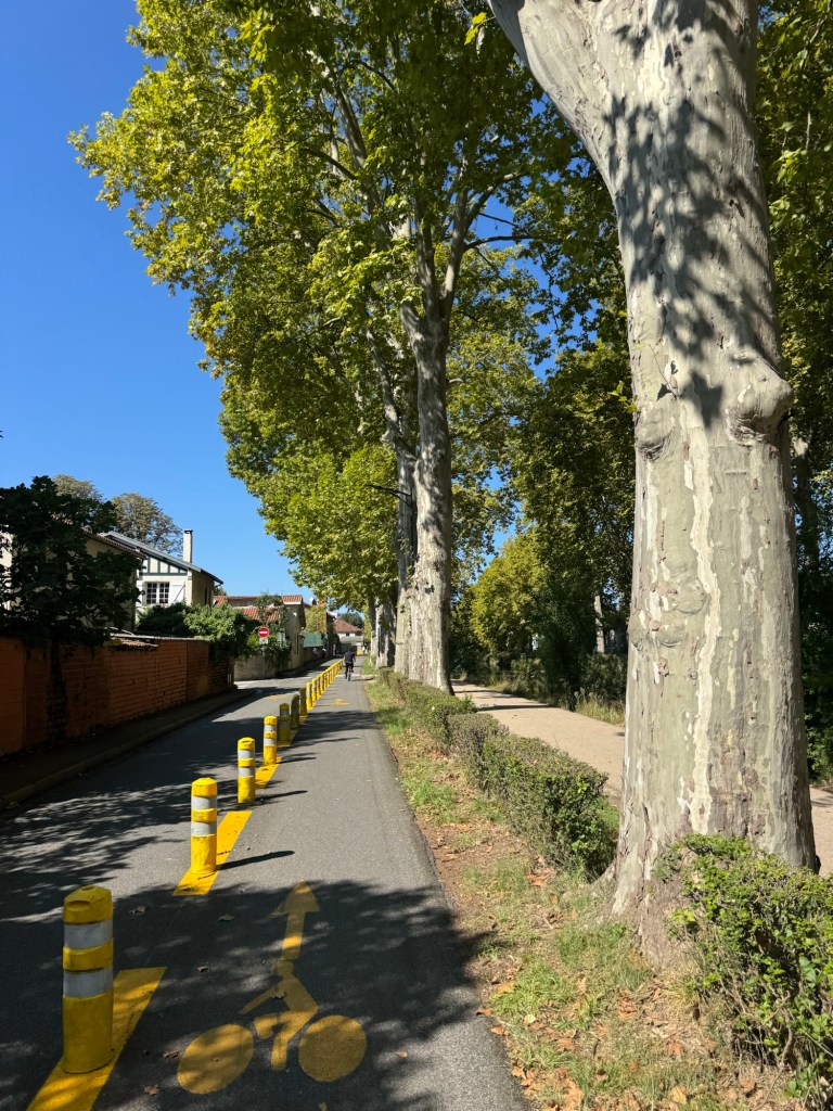 We’d left the gravelly paths behind so now we were flying along on smooth tarmac, in the cool shade of the magnificent plane trees.
