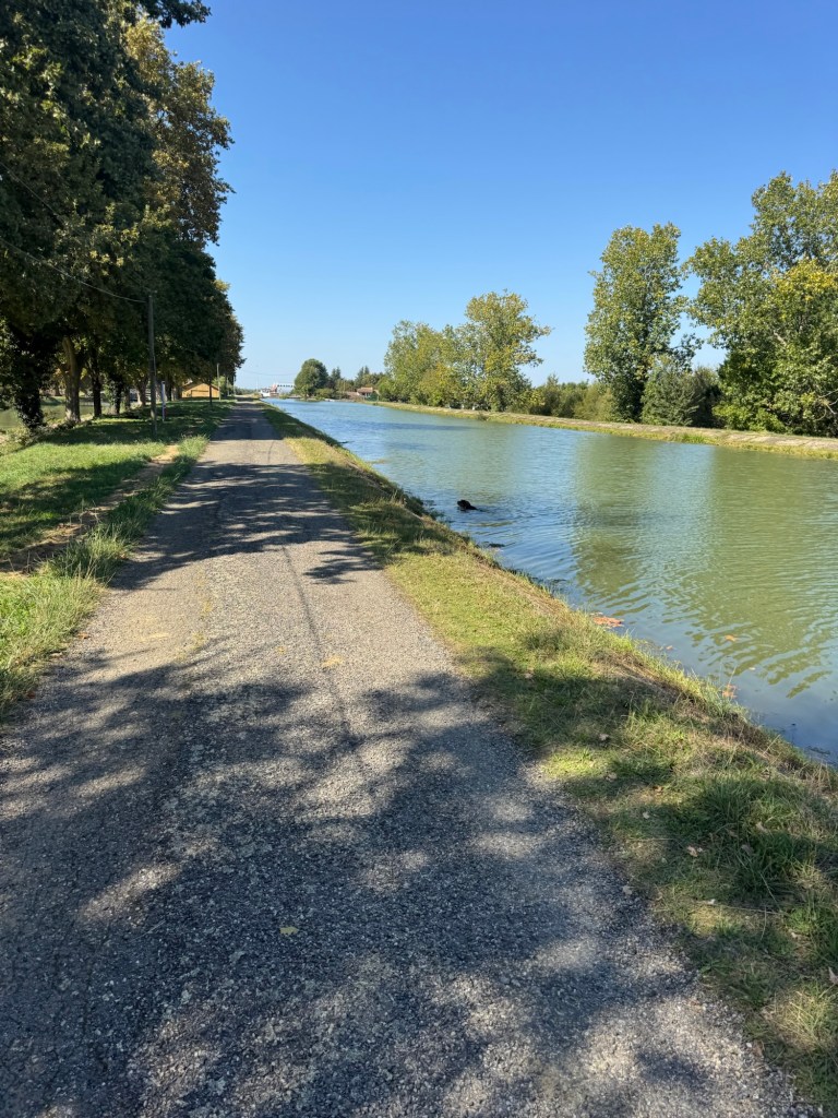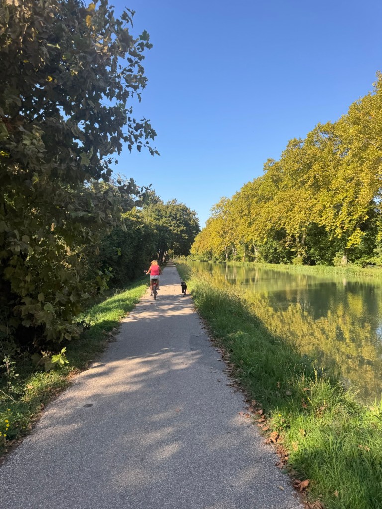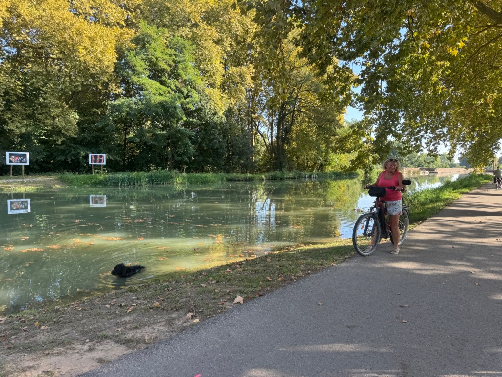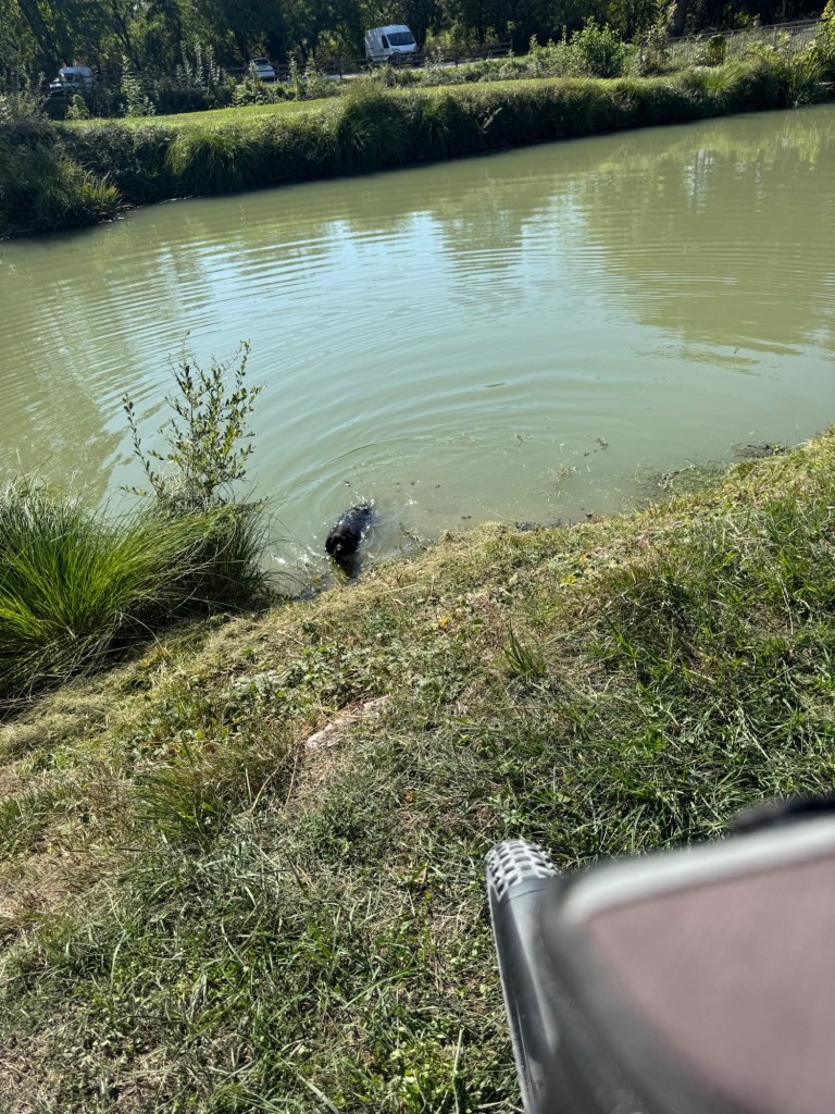 Lucky Huxley, but poor Dizzy who had to run the 20 kms to Moissac! Fortunately the canal had easy access for her to keep getting refreshed!