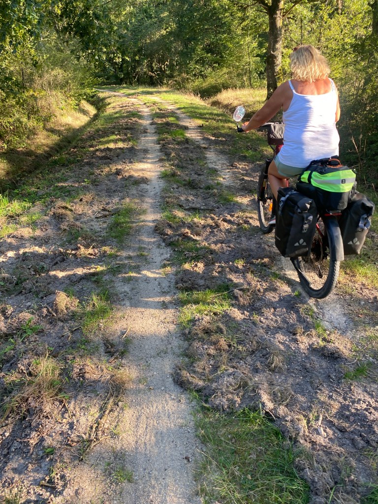 Shortly after lunch we picked up a follower, who decided he needed some exercise. We asked a couple of people if they knew where he was from, to no avail. Fortunately some walkers came by who he then befriended. We had to set off to again to pass the walkers and dog. We needed to pedal as fast as possible for a km to ensure he didn’t follow us! Our track then returned on the opposite side of the canal and we could still see our canine friend with the walkers!!